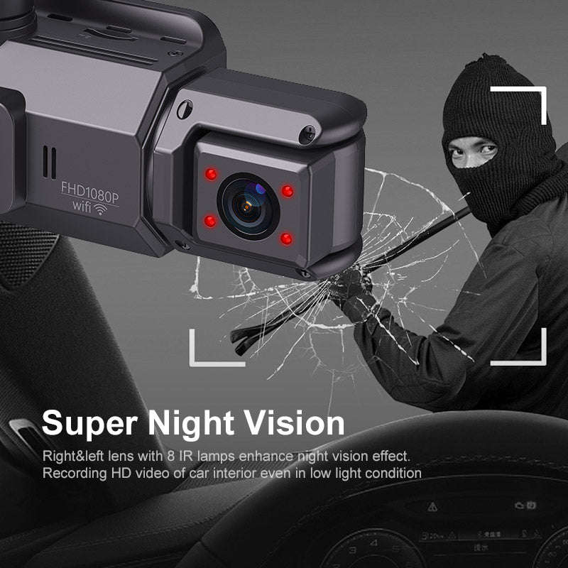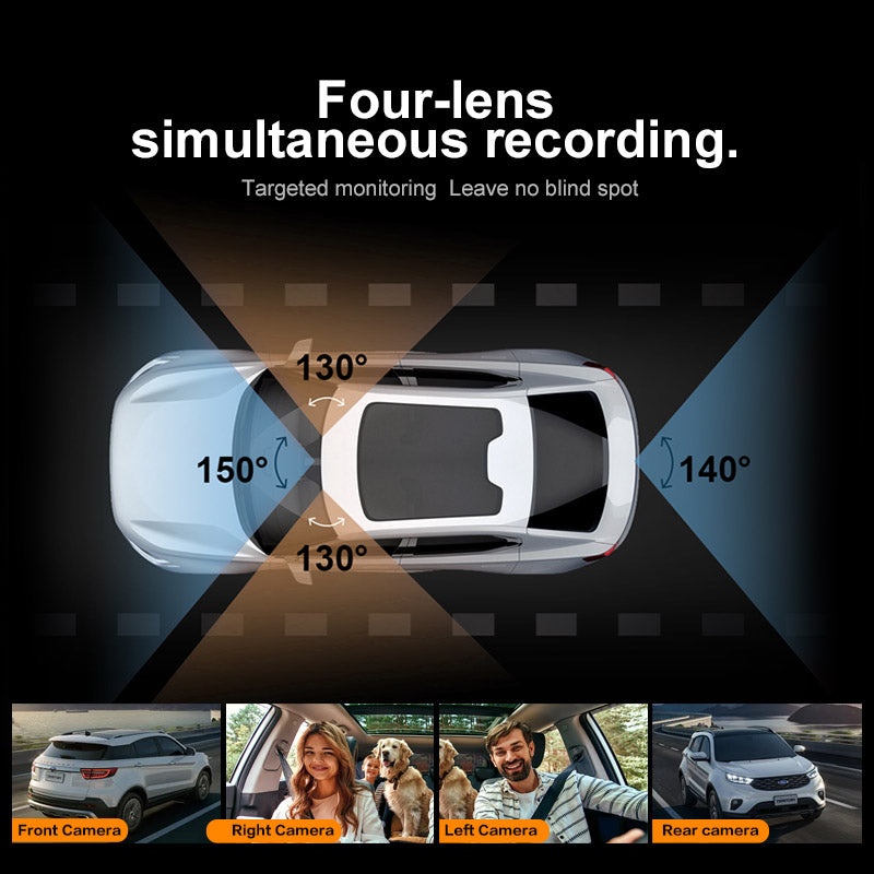 The Car Dashcam AD375 features a front camera and rear camera, each with 1080P resolution, as well as left/right cameras with 1080P resolution. The device also includes a 3.0 inch IPS screen, 140 degree wide angle, and a 2.0 mega pixel CMOS sensor. It records at FHD 1920*1080P / @30fps and conveniently plugs into a 5V/2.5A car charger. The built-in RTC button battery powers the device, while the video format is TS/H.264. It can support microSD cards from 8GB to 128GB (class 10 or higher), and even has built-in WIFI and external GPS functions. Other features include loop recording, Parking Monitor (with ACC hard-wire kit), and IR night vision for the left/right camera.